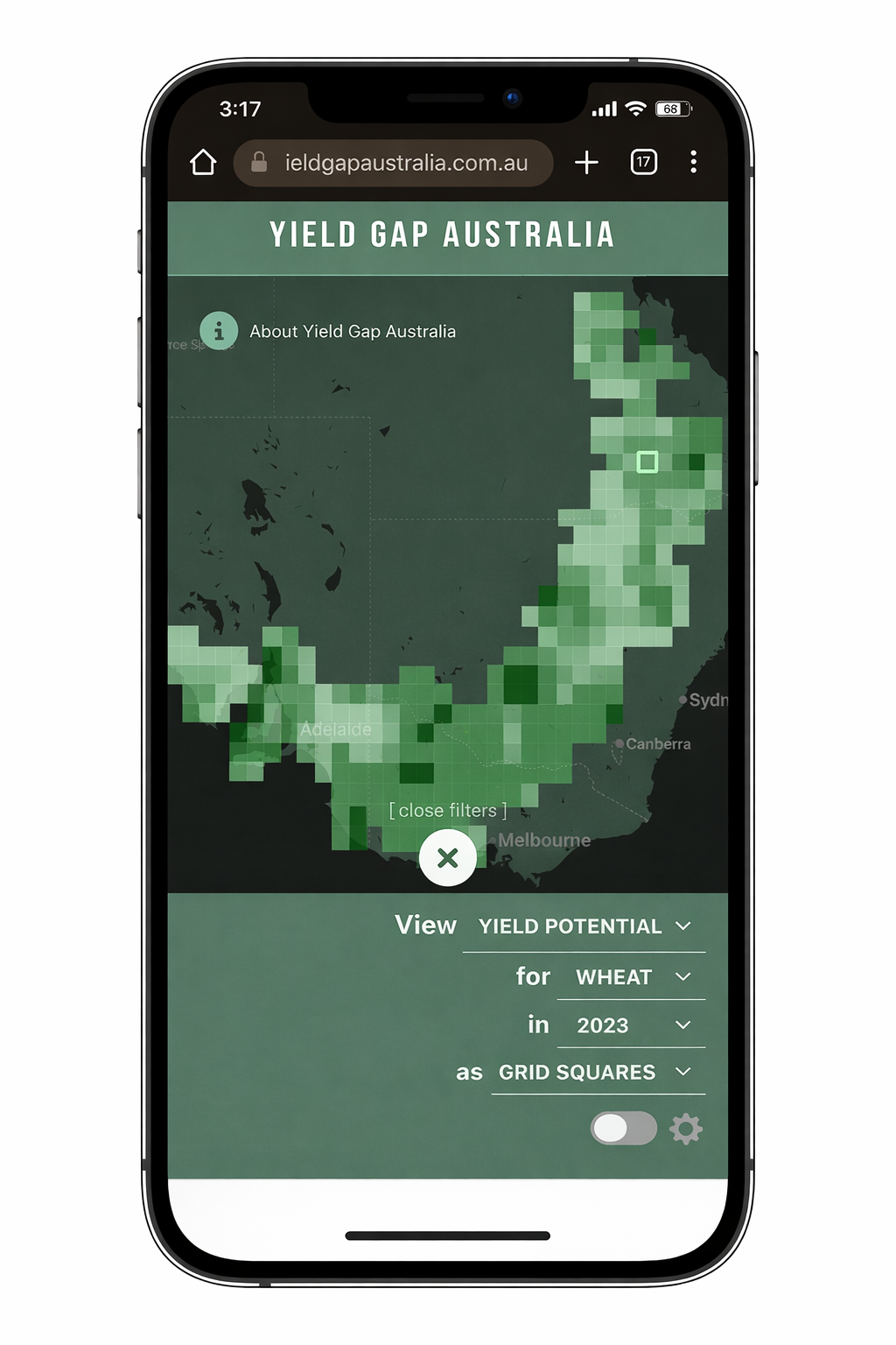 Yield Gap Australia v2 is an interactive map-based tool for grain growers, agronomists, research funders and policy makers. It shows the extent and geographic distribution of the yield gap (the gap between actual and potential crop yield) of rainfed wheat crops in Australia. Having built the initial Yield Gap Australia tool many years ago, the brief for the remake was to make it cool and interactive while retaining the strong science focus. We designed and developed all parts of the new Yield Gap Australia site for CSIRO, working with the provided complex datasets to bring the reimagined tool to life.