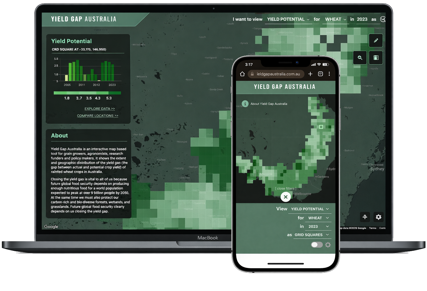 We created a wireframe prototype and workshopped this with the CSIRO team until everyone was happy with the planned concept. We then started building the new website. The new version of Yield Gap Australia is a fully client-side rendering application written in React + Redux with Python data processing integrated into the build process. The dataset structure is based on a multi-level (zoom) split of the map grid, using JSON files instead of a database (similar to Redis). Of particular note is the speed of the site considering the amount of data being rendered - we're very proud of the zippy end product that required some very clever engineering.